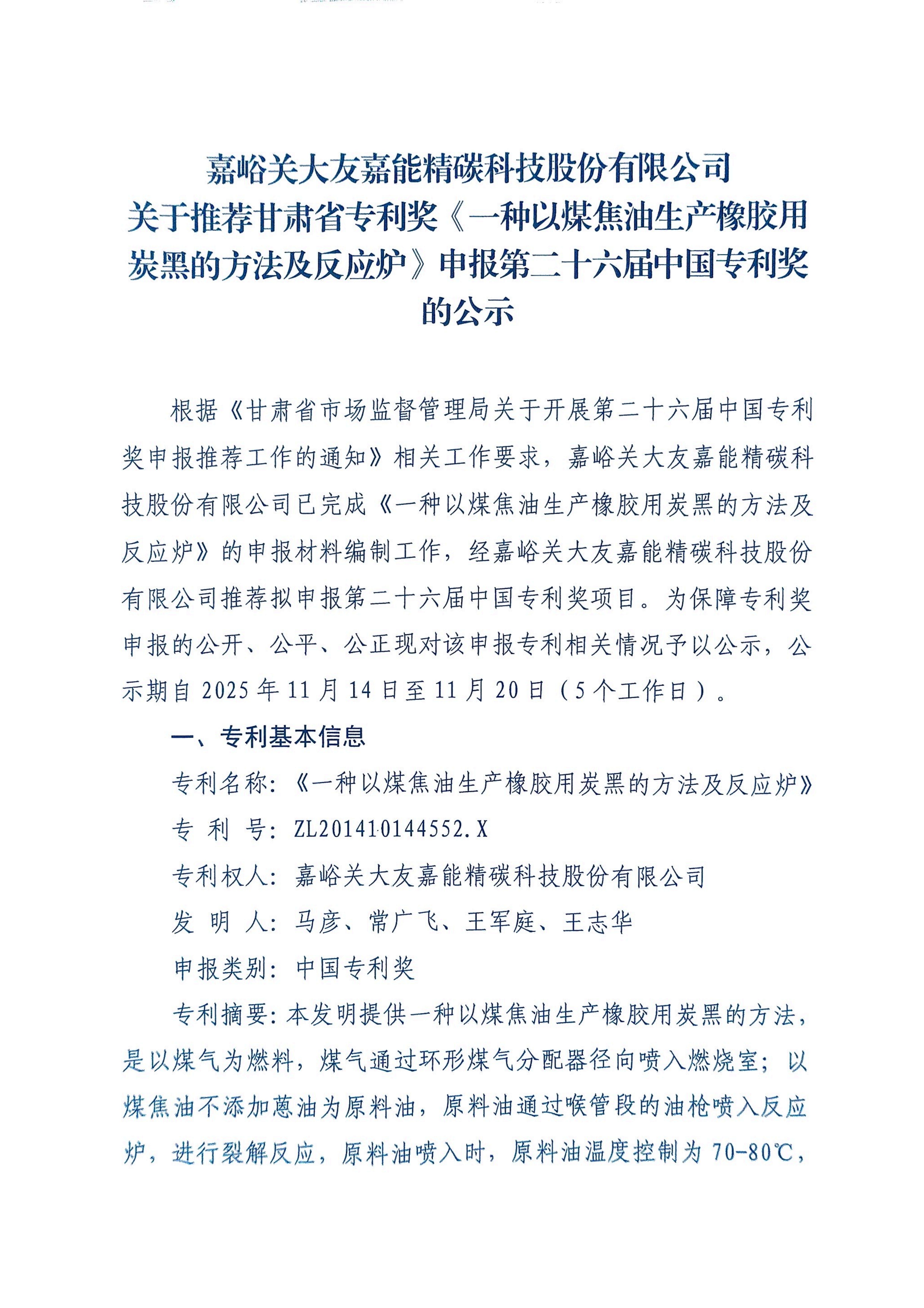 嘉峪关大友嘉能精碳科技股份有限公司关于推荐甘肃省专利奖《一种以煤焦油生产橡胶用炭黑的方法及反应炉》申报第二十六届中国专利奖的公示